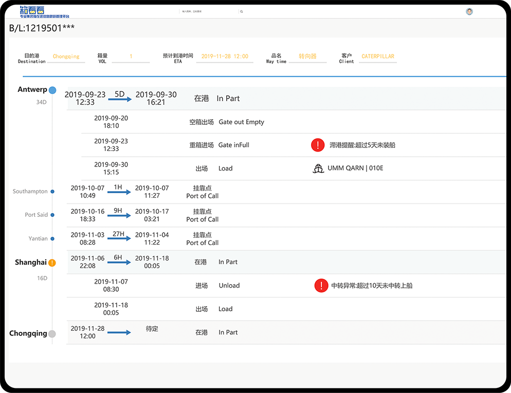 箱看看首推“全程管理”概念,从起运港、中转港到目的港,全程数据覆盖,监控每一个节点,预警每一个异常,让管理无死角