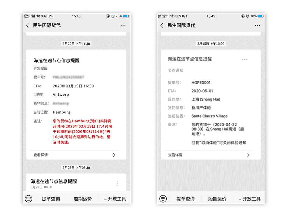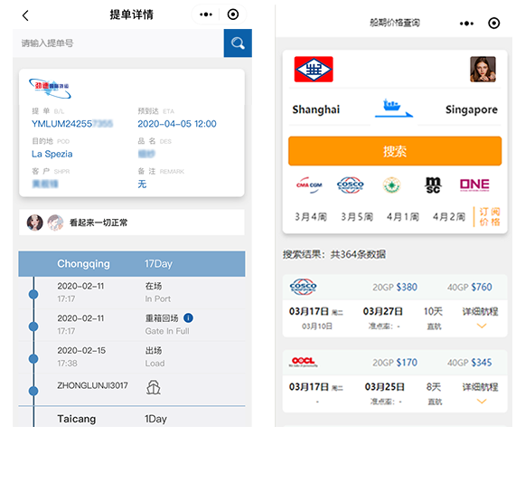 提单查询、节点通知、异常提醒、船期查询、运价查询